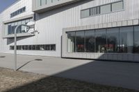 This is an image of a modern office building in the business district of Toronto, Canada. The building features a grey composite material facade with large windows and a glass door. The urban design is characterized by the hard shadows on the asphalt road surface. The metal walls of the building add a touch of modern architecture to the cityscape. This photo represents a typical day in Toronto's urban landscape, showcasing the combination of business and architecture in the bustling city.