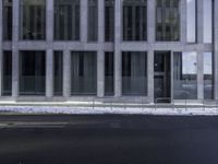 This is an image of a large office building in the city. The building has a rectangular shape with a grey facade. The windows reflect the tints and shades created by the surrounding environment. The building stands in front of an empty street, with the road surface glistening under the natural light. A man can be seen taking a picture on his cell phone. This photo captures the modern architecture and urban atmosphere of the city.