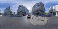 A modern cityscape in Berlin, Germany. The fish-eye view captures the bustling intersection with fast-moving vehicles. The architectural mix of apartment buildings, corporate headquarters, and office buildings reflects the dynamic and urban nature of the city. Winter adds a touch of cold charm to the scene.