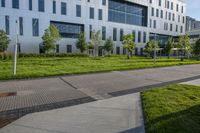 This is an image of a high-rise building in the business district of Toronto, Canada. The modern architecture of the office building stands out against the urban landscape. The city is bustling with activity, with cars on the road and people walking on the sidewalk. The clear sky above adds a sense of brightness and optimism. The building has large windows and a concrete surface, reflecting the urban design and architecture. This photo represents the dynamic and modern atmosphere of Toronto's business district.