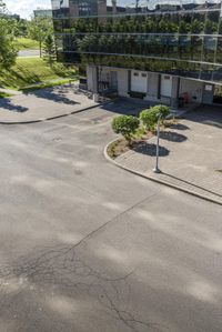 A view of modern architecture in Toronto, Canada. Tall buildings line the city streets, surrounded by lush vegetation. The concrete road surface and elevated walkways create a dynamic urban landscape. Suburban houses and loading docks complete the picture.