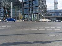 Modern urban design in Berlin, Germany. Blue car driving past pedestrians on the city intersection. Central station in the background highlights the architectural beauty of the city. A vibrant day in Europe's capital.