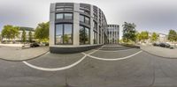 A unique perspective of a city intersection captured through a fisheye lens. The modern architecture and open space create a vibrant urban design. Clear skies and hard shadows enhance the city's energy and atmosphere.