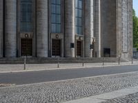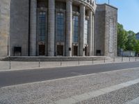 Urban scene in Berlin, Germany, showcasing classic architecture near Volksbühne theater. Clear sky highlights the elegant urban design. Busy asphalt road with city life and European charm.
