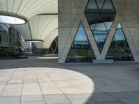 This stock photo captures the vibrant city life in Asia, specifically in Kaohsuing, Taiwan. The image displays a square paved area with three arches, situated high on one of several tall buildings. The concrete wall and glass wall create an interesting visual contrast. The hard shadow adds depth to the scene, highlighting the urban design of this bustling city. The day is bright, showcasing the modern architecture and surface of the area. Kaohsuing, also known as the Republic of China, is a prominent city in Taiwan, located in Asia, on the continent of Formosa. This photo perfectly represents the dynamic energy and urban atmosphere of this captivating city.