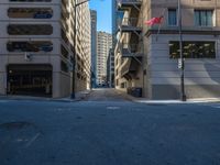 Modern architecture in Atlanta, Georgia. Straight down the road, urban alleyways reveal the city's dynamic profile. Clear skies cast hard shadows on asphalt roads. Urban design at its finest.