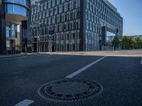 This is an image of an empty road in Berlin, Germany, surrounded by a glass office building. The modern architecture and urban design of the building reflects the city's business district. The clear blue skies and hard shadows add to the vibrant atmosphere of the scene. The photo represents a typical day in the financial district of Berlin, showcasing the city life and urban architecture of Europe. It captures the essence of modernity and sophistication in a bustling cityscape.