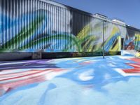 This image showcases the vibrant art district of Berlin, Germany. The clear blue sky provides a backdrop to the city's modern architecture and colorful graffiti walls. The painting on the walls depict a variety of multicolored murals that adorns the city streets. The open spaces and courtyards in this urban setting are perfect for exploring the city's unique blend of urban design and warehouse galleries. Berlin is known for its vibrant street art scene, and this image captures the essence of the city's creative spirit and lively city life.
