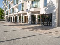 This stock photo showcases the vibrant city life in Berlin, Germany. The image features a brick sidewalk outside of a modern building with glass windows on either side. The street in front of the building is made of cobblestone, adding to the charm of the urban architecture. The clear sky overhead enhances the overall aesthetic of the residential area. This photo perfectly captures the essence of urban design in Europe's dynamic capital city.
