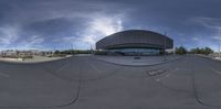 an empty parking lot with a sky in the background and a circular design on the pavement