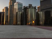 Los Angeles cityscape at dawn, with futuristic architecture dominating the urban skyline. The break of day paints the sky in vibrant hues, contrasting with modern office buildings and concrete surfaces below.