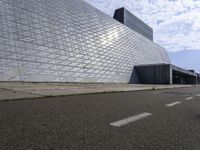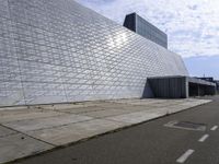 This is a photo of a modern building facade in Zaragoza, Spain. The structure features a rectangular shape with a combination of white and grey colored tile wall giving it a sleek and contemporary design. The photo was taken during the day, capturing the clear sky and clouds in the background. The building is located in the business district of Zaragoza, reflecting the city's urban and financial hub. With its modern architecture and distinctive tile wall, this structure stands out as a prominent landmark in Zaragoza's urban design.
