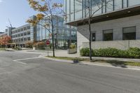 A clear day in Toronto's business district with modern architecture and office buildings lining the road. The traffic light changes, signaling a bustling city life. Trees in the background add a touch of nature to this urban landscape.