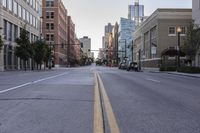 A sunny day in downtown Denver, Colorado, with a modern skyline and skyscrapers. The straight road leads to the city's bustling center, surrounded by office buildings and residential areas. Transportation infrastructure, including roads and traffic lights, guides vehicles through the metropolitan area.