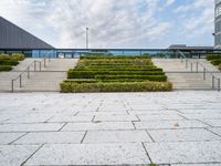 This image captures a cloudy day in Berlin, Germany. The photo showcases the modern architecture of the conference center with its unique design and urban features. Outside the building, a set of stairs leads to an open space filled with shrubbery and vegetation. The cloudy sky sets the atmosphere for this urban scene. The photo represents the vibrant city life and urban design of Berlin. The empty building and the surrounding area showcase the beauty of the city's architecture. This photo is a perfect representation of the modern and diverse capital of Germany.