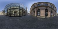 A modern urban design in Berlin, Germany, showcasing glass walls and straight alleyways. The architecture reflects city life in Europe with hard shadows on cobblestone surfaces. This museum stands out under the clear sky.