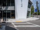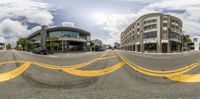 a street with yellow stripes on the ground and buildings around it is shown as a fisheye lens