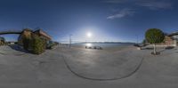A modern architecture marvel in Lisbon, Portugal. The composite material benches surrounding a fish-eye lens capture the vibrant city life. Clear blue skies and a waterfront pier create the perfect urban open space.