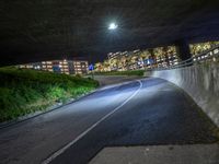 A view of a city street in Los Angeles at night. The road is illuminated by street lights and artificial light, casting a modern and urban vibe. The dark sky contrasts with the modern architecture of the city.