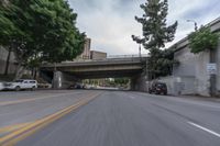 This is an aerial view of downtown Los Angeles, California, USA. The image captures the city's bustling urban life and modern infrastructure. The roads and highways stretch across the cityscape, with cars moving along the asphalt streets. A bridge can be seen, connecting different parts of the city. The motion blur of the vehicles adds a sense of movement to the scene. The clear blue sky and clouds provide a beautiful backdrop to the urban design of Los Angeles. This photo represents the vibrant city life in the heart of California.