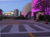 This stock photo captures the vibrant city life of Miami, Florida, as seen from the art district. A stoplight and crosswalk stand amidst the asphalt roads, lined with trees. The view includes a purple lighted building and a clear sky at dawn, giving a touch of artificial light to the cityscape. Miami's modern architecture and neon lights create a unique urban design. This image perfectly represents the energetic atmosphere of Miami Beach, USA.