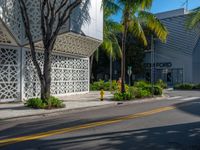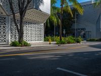 an empty street with a palm tree near a building with geometric patterns on it and two people