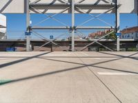 This stock photo showcases the vibrant city life of Berlin, Germany. The image features an empty parking lot with buildings in the background, a clear blue sky overhead, and symmetrical metal and wood structures that frame a bridge. The modern architecture and straight road design add to the urban charm of the city. The concrete street and parking deck provide a sleek and contemporary feel to the urban design. The hard shadows create intriguing patterns on the road surface, adding an artistic touch to the composition. This composite material image captures the essence of city living and the beauty of modern architecture in Berlin, Europe.