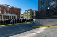 This image depicts a parking lot in a bustling city in Canada. The modern architecture of the surrounding buildings creates a striking urban design. The vibrant yellow line marking the parking lot stands out against the backdrop of the city. The buildings cast long shadows, indicating that it is daytime. The clear sky with scattered clouds adds a picturesque element to the scene. This photo captures the essence of city life in Canada, showcasing the urban landscape and reflecting the busy atmosphere of places like Toronto and Montreal.