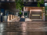 A nighttime view of a city's business district. Office buildings and street lights illuminate the wet road and urban design. The paver road reflects artificial light, creating a dark and atmospheric scene.