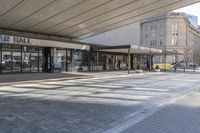 A modern architecture office building in Toronto's business district. The sleek concrete facade reflects the clear sky and the hustle and bustle of city life. The walkway and road surface are surrounded by urban infrastructure and shaded by street lights.