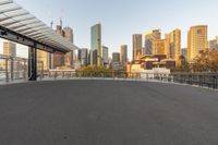 A modern business district in the heart of the city, featuring skyscrapers and high-rise condominiums. The clear sky provides a stunning backdrop for the urban landscape. Roads and open spaces offer a glimpse into the bustling city life.