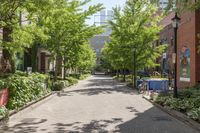 a wide street lined with trees near a sidewalk and lampposts in the city