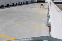 A view of an elevated parking deck at a Canadian airport in Toronto. The parking lot is spacious with many cars parked on the concrete surface. The area is fenced off and there are visible luggage carts. The sky is cloudy, and it seems to be a sunny day. This urban design captures the hustle and bustle of city life at the airport.