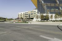 A modern office building in Toronto's financial district. Clear skies accentuate the sleek architecture and urban design. The bustling city life is reflected in the busy road and surrounding residential areas.