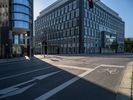 A straight road in Berlin's financial district, lined with modern office buildings. The fish-eye lens captures the city's urban design and architecture. Clear skies create hard shadows and reflections. A sunny day in Europe's bustling business hub.