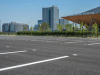 A view of a clear sky reflecting on the smooth surface of an urban parking lot. The asphalt provides a sleek and modern look, complementing the urban design of the city. A perfect day for city life.