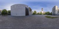 A modern architectural structure on an island in Berlin, surrounded by trees and a clock tower. The cityscape showcases urban design, with concrete and wood walls. A perfect blend of nature and city life.