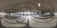 a reflection image on the floor in an indoor gym area with a roof and circular stairs