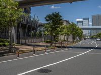 A modern urban cityscape with a bridge and underpass. The road is lined with sleek modern architecture against a backdrop of clear blue skies. A vibrant representation of city life and urban design.