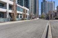 A modern architecture high-rise condominium building in the business district of Toronto, Ontario. Clear sky accentuates the sleek design and urban feel. Trees line the thoroughfare and add a touch of green to the cityscape.