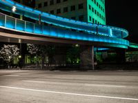 In the vibrant city of California, USA, this image captures the essence of urban life. A high-rise building dominates the skyline, with its illuminated facade and windows. Below, an empty road stretches out, punctuated by a lighted bridge. The city's artificial lights contrast with the clear night sky, creating a captivating scene. This photo showcases the bustling energy of the city and its urban design. It represents the business district of California, where the night is alive with activity and the streets are lined with street lights.