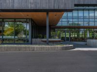 a building with a logo painted on the side near a street that has a sidewalk next to it