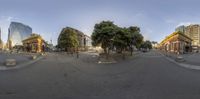 360 - panorama shot of city street with trees and people walking around in it on a sunny day