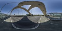 a fish eye lens shot shows the highway in the foreground and an arched bridge with arches over it