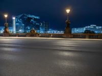 This stunning stock photo captures the beauty of city lights shining in the night sky in Berlin, Germany. The image showcases modern architecture and urban design with tall office buildings, artificial lights, and street lights illuminating the scene. The city's business district, known for its financial hub, can be seen in the background, creating a captivating view. The image showcases the dark night sky, with a bridge featuring a statue adding an artistic touch. Perfect for illustrating urban themes, architecture, and the vibrant nightlife of this European city.