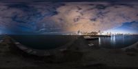 A stunning panoramic view of Chicago, Illinois at night. The city's iconic skyline reflects off the calm waters of Lake Michigan, creating a surreal and otherworldly atmosphere. The bright city lights illuminate the urban landscape, contrasting with the dark night sky.