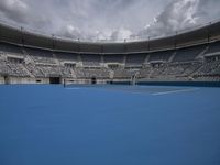 a tennis court in a stadium under a cloudy sky, with white and blue seating chairs