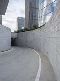 A modern office building in the city with a concrete facade and curved walkway. The building stands tall against a cloudy sky, reflecting the urban landscape. Businesses thrive in the bustling business district, with highway entrances and exits providing easy access.