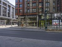 A cityscape of Berlin, Germany showcasing its modern architecture and vibrant city life. The streets of Friedrichstraße are lined with shops and storefronts, creating a bustling urban neighborhood. Reflective surfaces and public spaces add to its appeal as a tourist attraction.