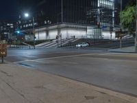 A nighttime view of a city street with illuminated street lights. Cars drive along the asphalt road, passing through the downtown area. Pedestrians use the crosswalks to navigate the urban landscape.